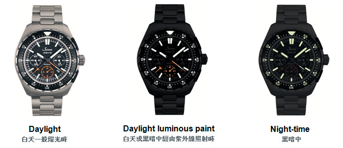 採用無害的磷作為超顯亮夜光塗料,在長時間無光線的環境中顯示時間刻度。 並採用Sinn風格的黑色消光面盤配置,減少無謂的反光而影響判讀性。